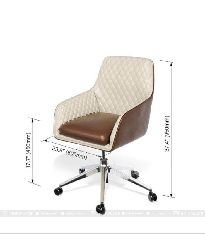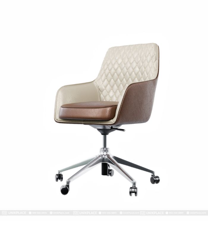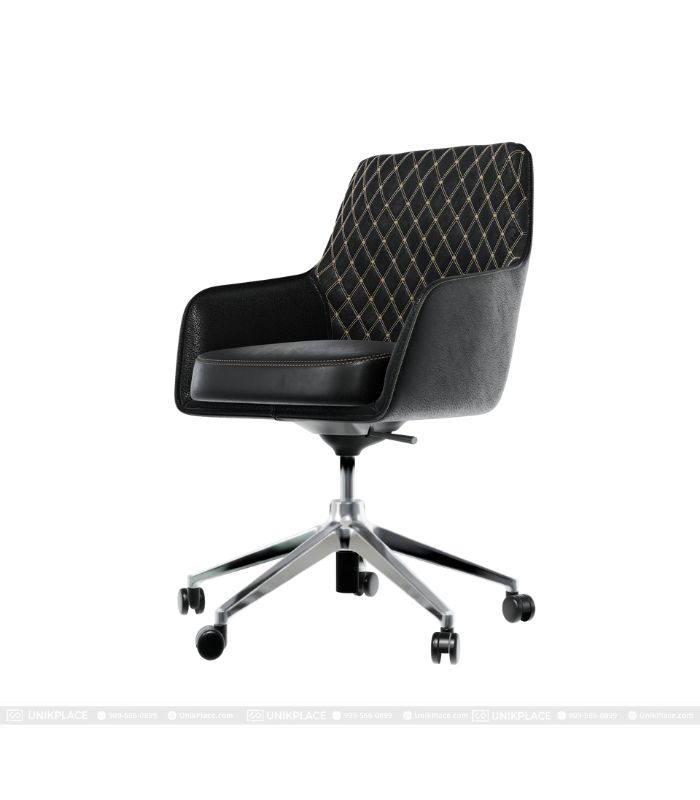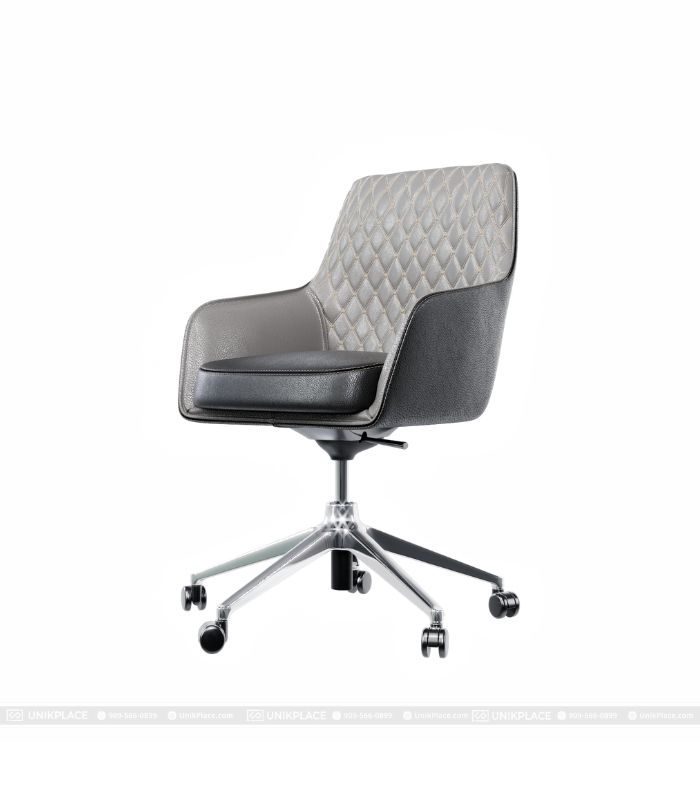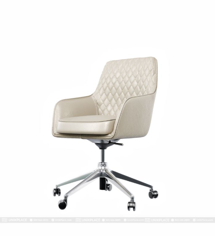 - Thiết kế: Ghế bọc da toàn phần, có tựa lưng và tay vịn tích hợp, chân đế 5 bánh giúp di chuyển linh hoạt
